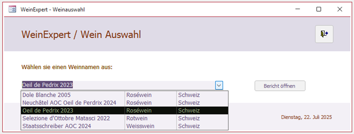 Das Formular dazu: Das Formular hat nur ein Kombinationsfeld zur Auswahl der vorhandenen Weinnamen. Sie wählen den Weinnamen und öffnen den Bericht direkt aus diesem Formular über den Button „Bericht öffnen“ (siehe Pfeil 3). Das Kombinationsfeld basiert auf dem Feld: „Weinname“ aus der Tabelle: „tbl_verkostung“. |