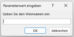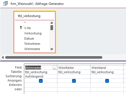 Eine Lösung über ein Auswahl Formular: In der Abfrage geben sie das Kriterium in folgender Form ein. Hier ist der Name des verwendeten Formular „frm_Weinwahl“ und der Name des Textfeldes ist „WeinnameWahl“ (siehe Pfeil 2). Also sucht die Abfrage beim Start nach diesem Formular und dem aktuellen Textfeld. Abfrage funktioniert nur wenn entsprechendes Formular geöffnet ist. |