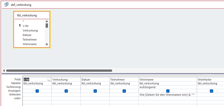 Ein Bericht wird meistens über eine zugrundliegende Abfrage erstellt. Die Ausgabe des Berichts können sie über eine Parameter Kriterium einschränken (siehe Pfeil 1). Hier eine Lösung wo sie auch das Sternchen verwenden können. Diese Lösung hat einen Nachteil. Sie kennen ja, wie hier im Beispiel, nicht alle Weinnamen auswendig. |