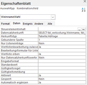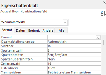 Im Eigenschaftsblatt zum Formular müssen diese Eigenschaften stimmen: · Die gebundene Spalte muss auf 1 stehen, also zum Feld „Weinname“ (siehe Pfeil 6) · Der Name des Kombinationsfeld „WeinnameWahl“ stimmt (siehe Pfeil 7) |