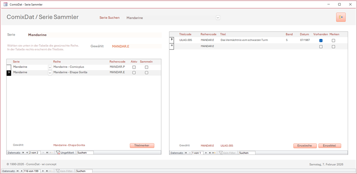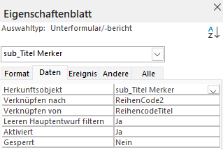 Ergebnis Jetzt werden im zweiten Unterformular die „Titel“ der „Reihe“ aus dem ersten Unterformular angezeigt. |