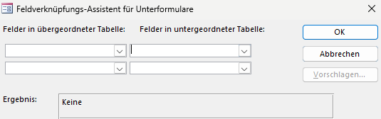 Verknüpfung 2 Das erste Unterformular soll eine Verknüpfung zum zweiten Unterformular von „Reihencode“ zu „Reihencode“ erhalten. Der Assistent sucht jetzt eine Verbindung vom Formular zum zweiten Unterformular, kann aber das Feld „“Reihencode“ auf dem Formular nicht finden. Eine Verknüpfung ist somit nicht möglich. |