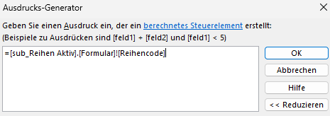 Lösung Als erstes erstellen sie ein ungebundenes Textfeld (5) auf dem Formular (1). Diesem Element übergeben sie den Inhalt des Felds „Reihencode“ (6) aus dem ersten Unterformular (3). Im weiteren vergeben sie diesem Feld (7) einen schlüssigen Namen (Beispiel „ReihenCode2“). Achten sie darauf, dass die Verbindung über eine Schlüssel ID erfolgt. Hier in diesem Beispiel ist der „Reihencode“ der ID Schlüssel. |