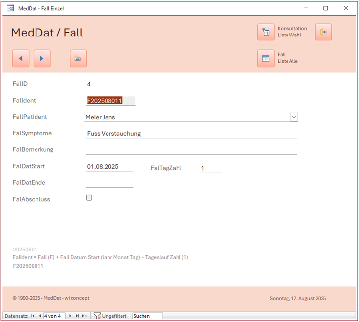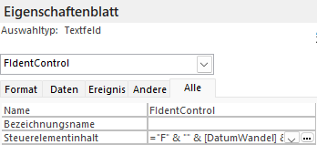 Access / Mit ungebundenen Feldern rechnen Anstelle des automatischen erzeugten Primärschlüssel ein eigener Identifikationsschlüssel aufbauen der mehr Aussagekraft aufweist. Zur Unterstützung des Eigenschlüssel Eintrages soll ein erscheinender Vorschlag zur Übernahme im Formular berechnet und dargestellt werden. Form des benötigten Identifikationsschlüssel: F202508011 = Zusammensetzung für Fall (F) + Start Datum (Jahr Monat Tag) + Tages Zahl Erstes Feld (F) ist ein reiner Buchstabe (Zeichen) Zweites Feld (Start Datum) umwandeln in andere Form Drittes Feld (Tages Zahl) fortlaufende Nummer für mehrere Fälle an gleichen Tag. Start Wert 1. |
