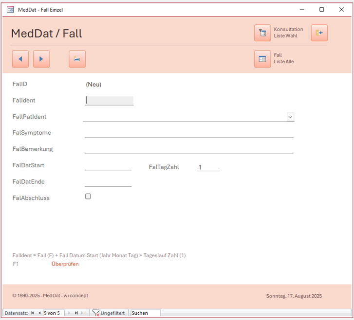 In der Access Tabelle „Fall“ wurde das Feld „FalTagZahl“ mit 1 vordefiniert. Wenn das Formular als Leer für neue Datensatzaufnahme gestartet wird sieht das Formular so aus. |