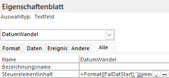 Zur Unterstützung wurden drei ungebundene Felder eingebaut. Erstes ungebundenes Feld Datumsberechnung im anderes Format: 1. Eigenschaftenblatt für ungebundenes Feld starten 2. Ein Name für das ungebundene Feld vergeben > Im Beispiel „DatumWandel“ 3. Unter Steuerelementinhalt die Berechnungsformel eingeben 4. Zur Unterstützung den Ausdrucksgenerator aufrufen (…) und Formel kann besser eigegeben werden |