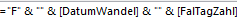 Die Formel für das Verketten von Zeichen und Feldern: =“F“ & ““ & [DatumWandel] & ““ & [FalTagZahl] F = F als fixes Zeichen definiert & ““ & = Verketten mit dem Ergebnis des ersten ungebundenen Feldes und zusätzlich Verketten mit der Tageslauf Zahl. Ergebnis: F202508011 |
