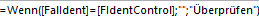 Die Formel für den Check über ein Wenn Abfrage aufbauen: =“Wenn([FalIdent]=[FIdentControl];““;“Überprüfen“) Ergebnis: Wenn beide Schlüssel gleich sind wird nichts ausgeben, wenn Schlüssel ungleich sind wird Hinweistext „Überprüfen“ ausgeben. |