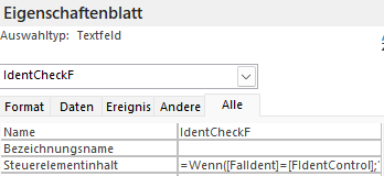 Drittes ungebundenes Feld Check der Eingabe im „FalIdent“ Feld zu Ergebnis „FIdentControl“: 1. Ein Name für das ungebundene Feld vergeben > Im Beispiel „IdentCheckF“ (fakultativ) 2. Rest gleich wie oben beschrieben |