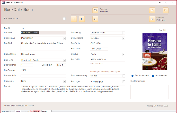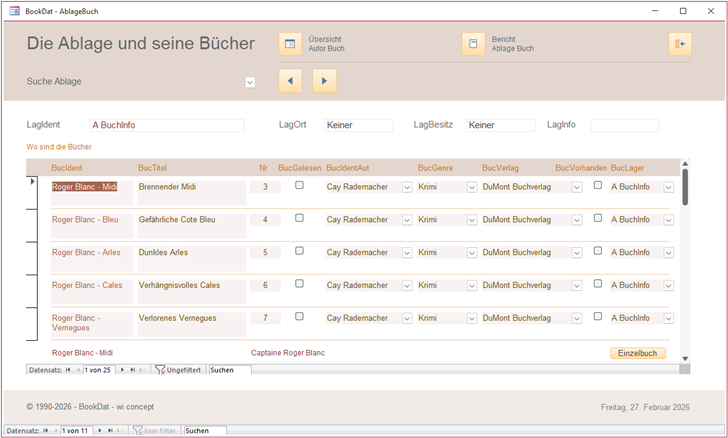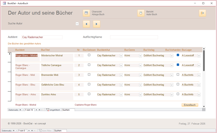 BookDat Anwendungszweck Man liest Bücher und am Schluss werden sie weitergegeben oder entsorgt. Nicht alle bewahren ihre Bücher auf. Jahre später weiss man nicht mehr so genau welches Buch hat man doch jetzt zu dieser Krimiserie gelesen hat oder doch nicht. Diese Datenbank kann helfen, Ordnung im Gedächtnis zu schaffen. Umsetzung Als Access Datenbank Vorlage. Die Access Datenbank wird seit Jahren stetig weiterentwickelt. Die jetzige Fassung wurde grundlegend überarbeitet. Es werden zum Aufbau der Datenbank keine tiefgreifenden Codes verwendet. Sie ist kostenlos und besitzt eine offene Struktur. Wer ein Office 365 besitzt (installiert auf Desktop), kann diese Datenbank direkt verwenden. Für andere empfehlen wir die Microsoft Runtime Version. Download Die Datenbank Vorlage und die Kurzanleitung ist |