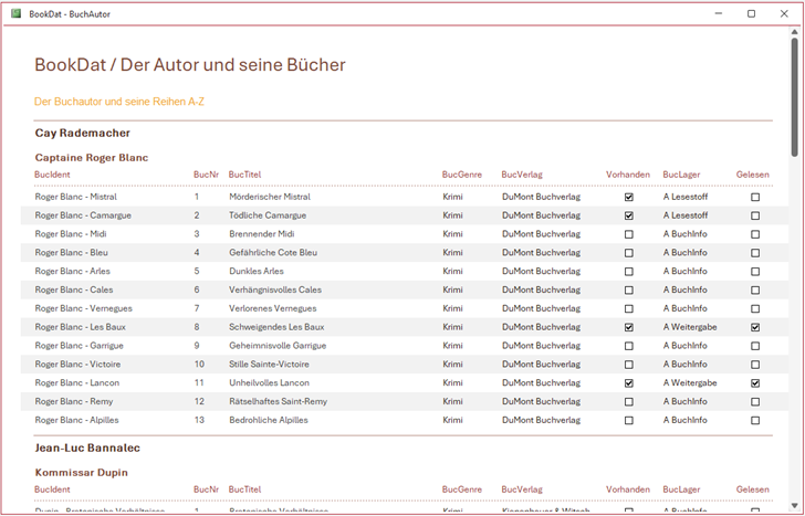 Übersichten Zu einem Autor sehen sie alle seine Bücher. Sie sehen ob sie gelesen sind und wo sie abgelegt sind. Der Fokus der Datenbank liegt in ob Bücher gelesen sind, wo sie abgelegt wurden und für welchen Autor sie Bücher besitzen. |