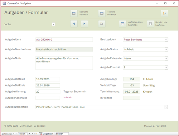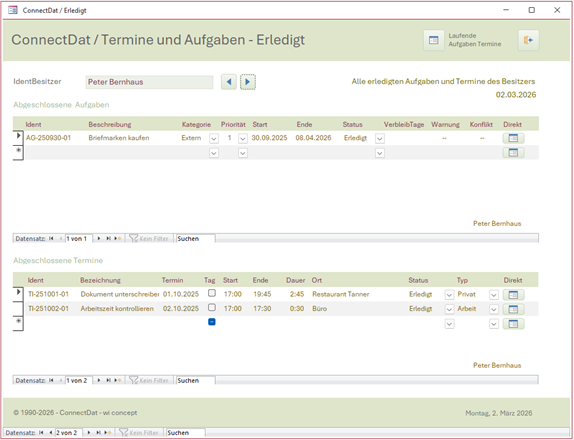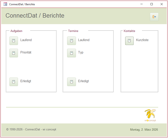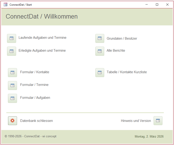 ConnectDat Anwendungszweck In Verbindung bleiben. Aufgaben erledigten, Termine planen, Kontakte pflegen. ConnectDat macht dies alles als Datenbank und nicht mit einem Kalender. Neues Gefühl die Dinge im Griff zu haben. Für Kontakte, Termine und Aufgaben sind umfangreiche Berichtsausgaben vorhanden. Umsetzung Als Access Datenbank Vorlage. Die Access Datenbank wird stetig weiterentwickelt. Die jetzige Fassung wurde grundlegend überarbeitet. Es werden zum Aufbau der Datenbank keine tiefgreifenden Codes verwendet. Sie ist kostenlos und besitzt eine offene Struktur. Wer ein Office 365 besitzt (installiert auf Desktop), kann diese Datenbank ebenfalls verwenden. Für andere empfehlen wir die Microsoft Runtime Version. Download Die Datenbank Vorlage und die Kurzanleitung ist |