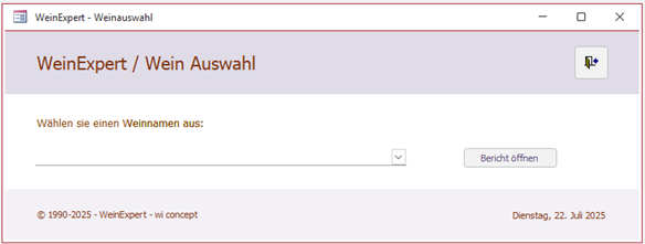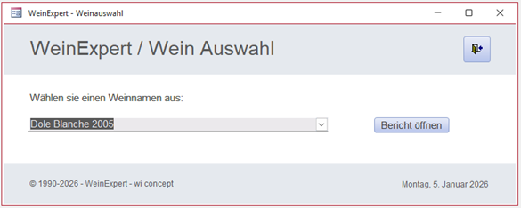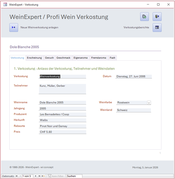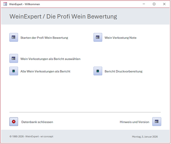 Wichtiger Hinweis Die Datenbank weist eine offene Struktur auf. Die aufgebaute Datenbank ist nicht geschützt. Anwender können die Datenbank in der Struktur anpassen, korrigieren oder erweitern. Dadurch entsteht im Generellen kein Support-Anspruch zu den angewendeten Vorlagen. Voreingetragene Datensätze (Beispiele) können entfernt werden. Sie dienen dazu, die Vorlage in ihrer Funktion besser zu verstehen. Die aktuelle Version ist auf der Downloadseite und in der Access Vorlage vermerkt. Die erste Wein Expert Access Datenbank wurde um 2005 auf Swiss Winetool veröffentlicht. Einschränkung: Eine Abänderung von Formularen, die eine Entfernung der Herausgeber Informationen nachvollziehen, werden nicht gewünscht. Eine Vermarktung der Datenbank jeglicher Art ist untersagt. |