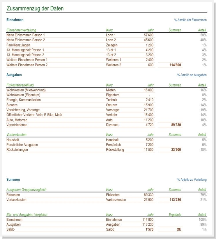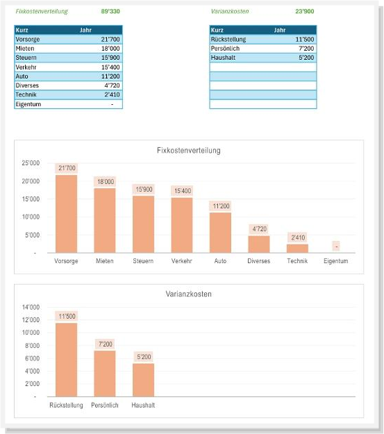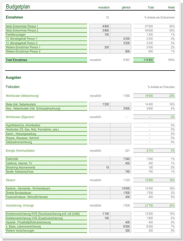 Startseite Das ausgefüllte Excel Vorlagenblatt. Strukturierung nach Schweizer Budgetberatung. Eingabe mittels Monats- oder Jahreskosten. Mit automatischer Jahresumrechnung und Anteilsberechnung in Prozent pro Gruppe. Sie sehen die grossen Kostenblöcke auf einen Blick. Alle Gruppenblöcke mit Summen Berechnung und monatlicher Belastung.